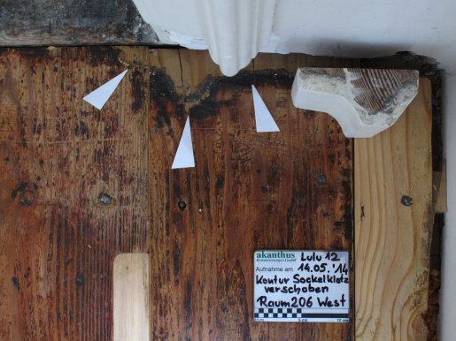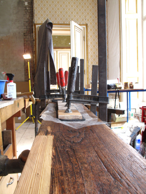Sejmutí slepé podlahy, vyčištění prostoru mezi trámy, elektroinstalace, opětovné položení slepé podlahy, rézování prasklin dílců vrchní prkenné podlahy, vlepení borovicových vložek s patřičnou orientací vláken, podlepení uvolněných letokruhů, opětovné položení vrchnní prkenné podlahy, výroba a doplnění prkna (vyplnění místa po sražení původních seschlých prken), povrchová úprava, retuše