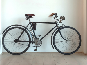 Konzervování, restaurování, repase a rekonstrukce pánského historického kola za 30. let 20. století. Výchozí stav: nepůvodní přední ráfek, nepůvodní duše a pláště, chybějící madla, nepůvodní levý pedál, chybějící držák pumpičky, vytahaný řetěz, svařovaný šlapací střed (pravá klika přivařena k ose), chybějící krytka středu, uvolněná levá klika, svařované a poškozené držáky obou blatníků, svařované konce přední vidlice, svařovaná přední pružina sedla. Provedeno bylo: demontáž "do šroubku", očištění původních dílů a jejich konzervace, postupná montáž s adaptacemi, oprava šlapacího středu (proplach, rozbroušení sváru, doplnění krytky, vyvložkování levé kliky, seřízení), rozbroušení svárů přední vidlice a její retuš, doplnění odpovídajícího předního ráfku s osou, vycentrování obou ráfků, revize torpeda, osazení ochranných vnitřních pásků ráfků, osazení odpovídajících historických duší a plášťů, odstranění poškozených držáků blatníků, výroba a osazení (nýtování) nových držáků blatníků, doplnění chybějících nebo nepůvodních drobností: odpovídající historické šrouby, matice. Nové díly (repliky původních): dřevěná madla (vnitřní průměr 22 mm), řetěz. Karbidka: celková repase (těsnění a uchycení skla, doplnění šroubu držáku, ponechání starobylého vzhledu). Zvonek: očištění, doplnění odpovídajících šroubů, promazání. Komponenty Assmann (BAL) dodané klientem: Sedlo, brašna, blatníkový znak, zámek s odrazkou, pumpička. Provedeno bylo: částečná demontáž, čištění kůže sedla, oprava nýtku, úprava šroubu sedlovky, čištění brašny a její vypnutí do správného tvaru, oprava prasklého řemínku. Rekonstrukce obou pedálů z odpovídajících historických dílů.